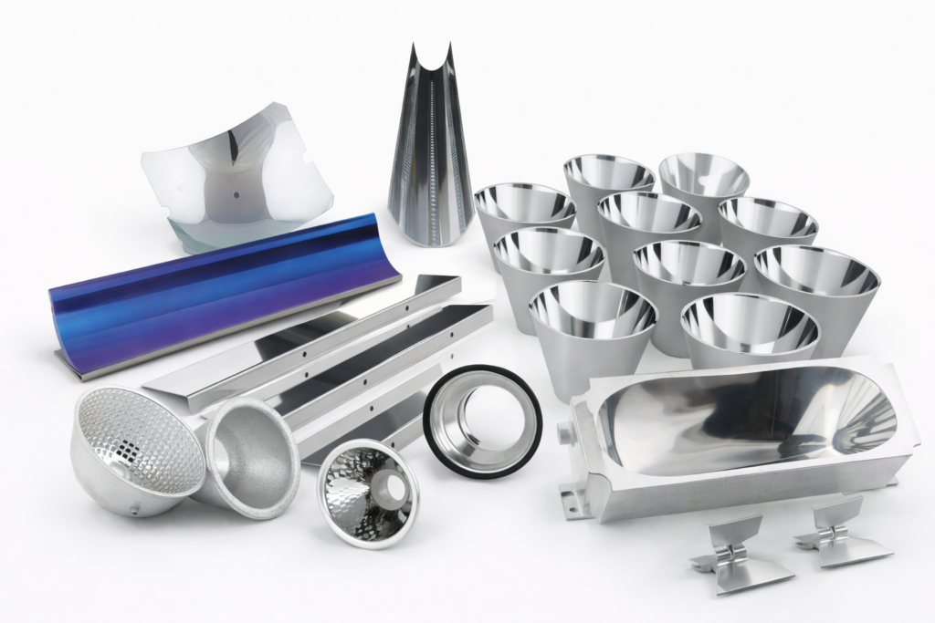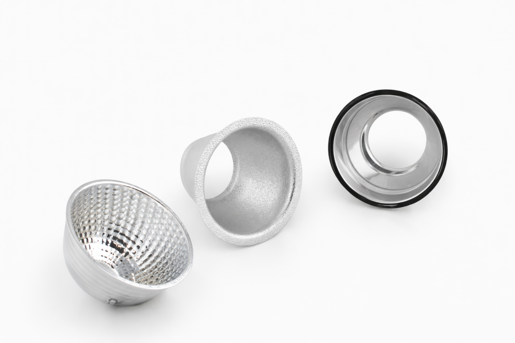Chaque réflecteur est conçu sur mesure afin d’offrir la meilleure combinaison entre efficacité optique, résistance thermique et durabilité.